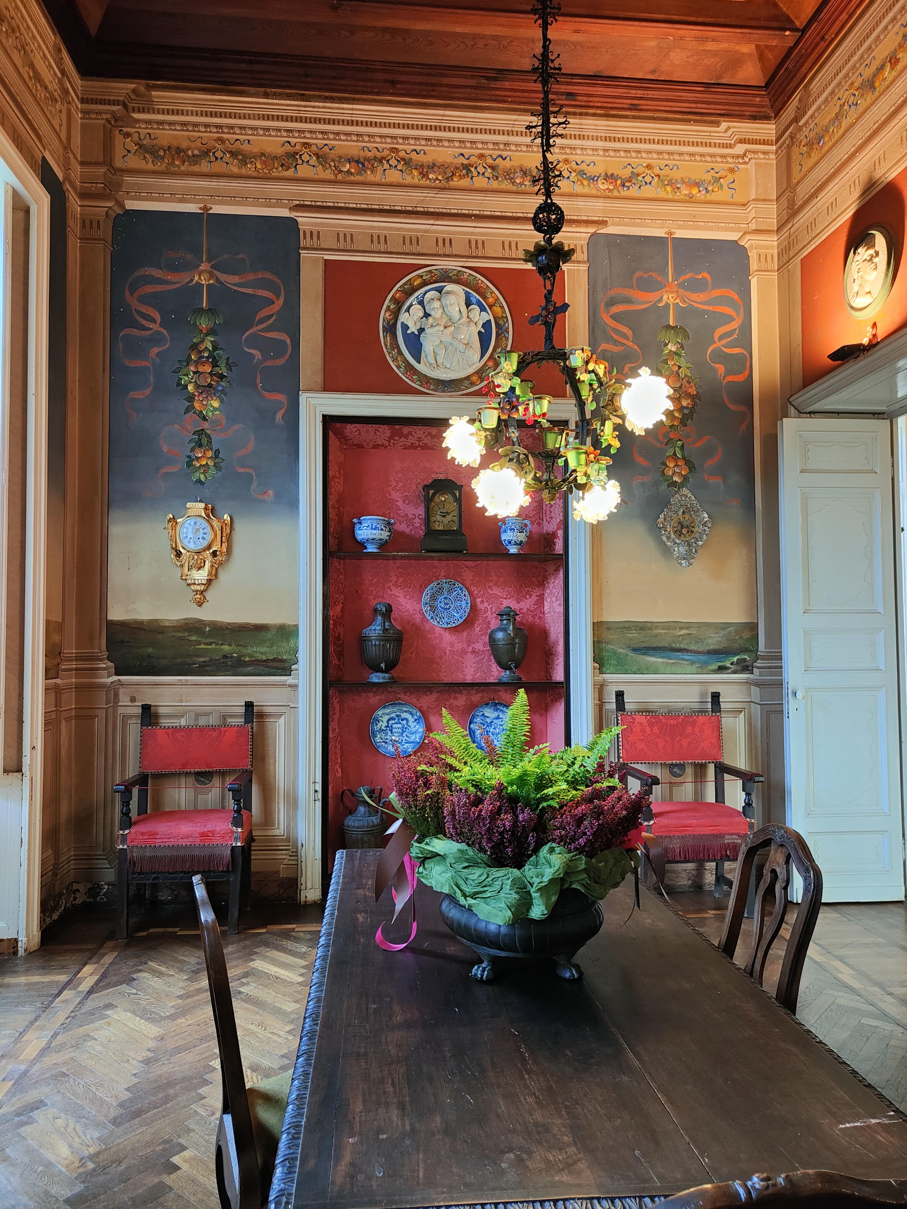 stupendi oggetti veri e propri arredi importanti! equel lampadario che scende sul tavolo fatto a fiori..non è bellissimo? Le travi lavorate del soffitto sono molto particolari.Penso anche al caratteristico odore di stantio dei mobili vecchi che sono presenti…Grazie Max per questo gioiello di villa! buona serata