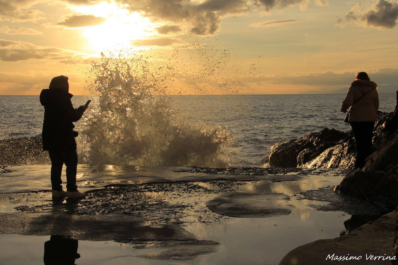 Incuranti delle ondate molti turisti rischiano di essere sepolti da autentiche bombe d’acqua, qui ne ho colto giusto una che coglie di sorpresa una persona intenta a fotografare il tramonto….