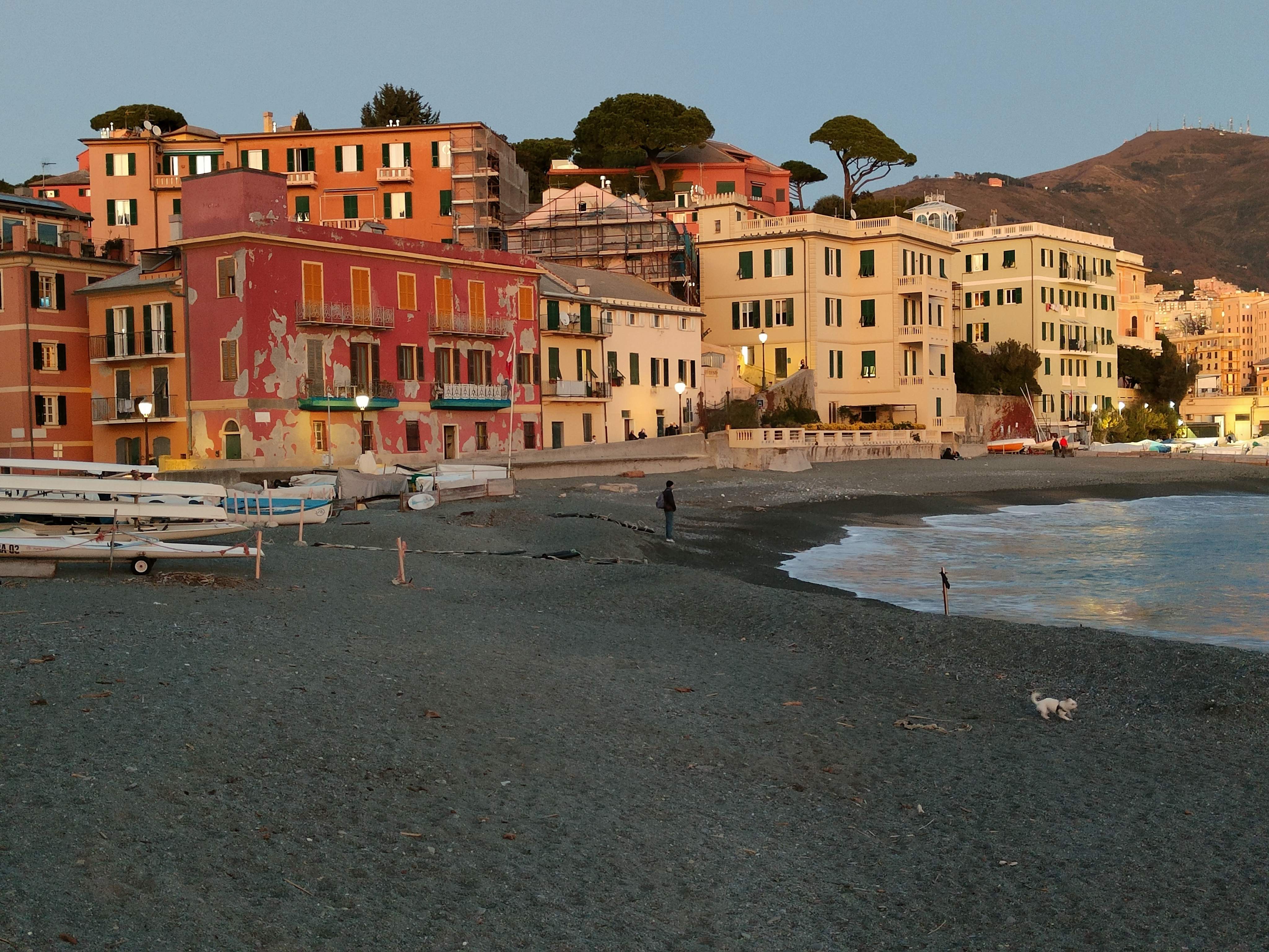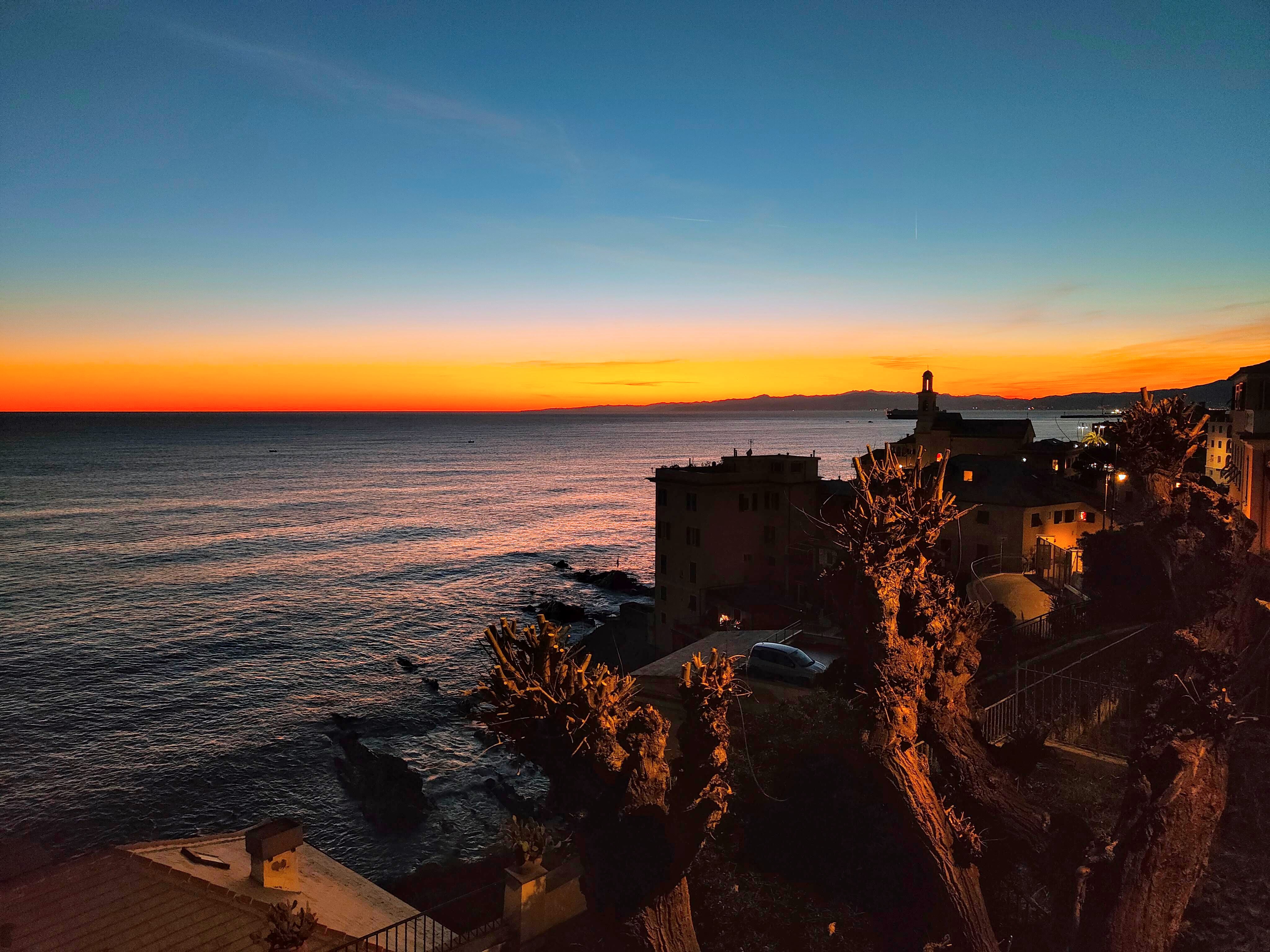 Torniamo a Boccadasse, sulle scogliere un freddo vento accoglie le ultime luci del giorno che sembrano vibrare su quell’orizzonte così nitido e limpido. Tutto qui appare fantastico, anche la notte ha un nuovo volto…