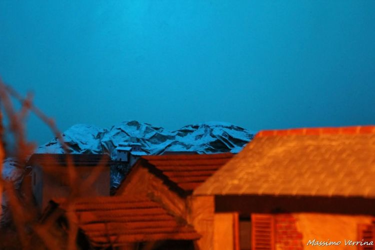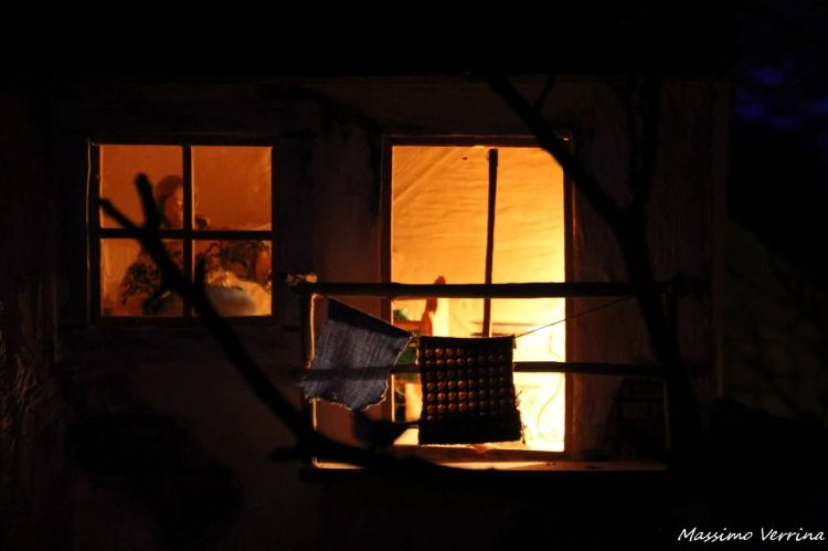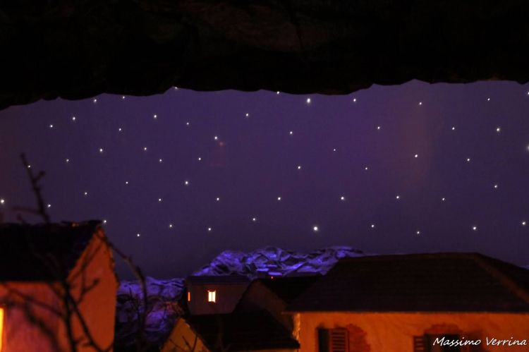 In questo presepe non manca neppure un cielo stellato, eccolo riprodotto sullo sfondo con i tetti delle case illuminati dalla luce della luna…..