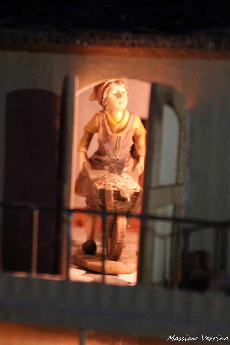 Con l’ultima parte di questa narrazione dedicata al presepe di Masone voglio farvi notare ancora dei particolari davvero belli. Nella foto di apertura avete visto i banchi della frutta, con i loro colori sgargianti. Qui sotto ecco spuntare dall’interno di una casa in ristrutturazione un muratore, con tanto di cemento nella carriola…