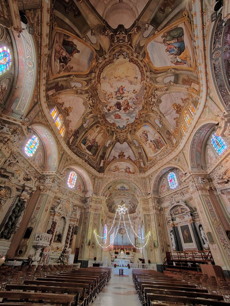 Una visione grandangolare ci permette di cogliere per intero la maestosa magnificenza di questa grande Chiesa, anche in questo caso a colpirci sono i moltissimi affreschi sul soffitto, ma anche le bellissime vetrate colorate in alto…