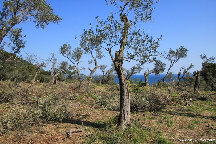 Stiamo camminando verso Ceriale, ci lasciamo alle spalle i bellissimi sentieri del Monte Piccaro e cominciamo a scendere verso l’abitato di Ceriale. Lungo la discesa troviamo delle potature di olivi, con questo campo dall’aspetto quasi surreale, anche un po’ spettrale, ma tutto ha un senso, la natura va curata in ogni fase dell’anno…