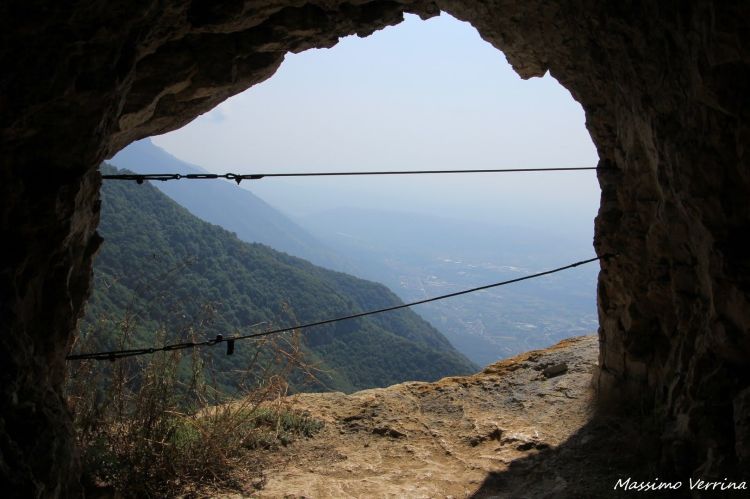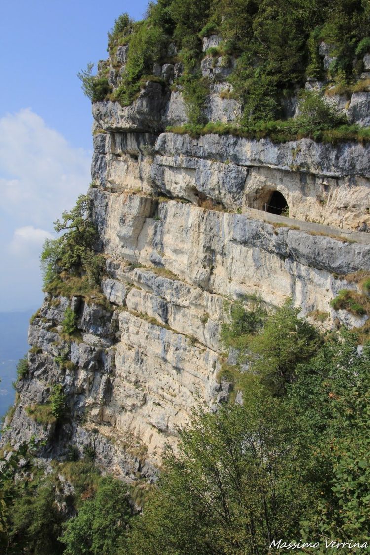 Attraverso questo spettacolare sentiero stiamo raggiungendo le altre gallerie, da qui il panorama sulla vastissima vallata è qualcosa di spettacolare, sembra di trovarsi su una montagna altissima, molto più di quello che realmente è. Questo effetto prospettico è dovuto alla ripidità della parete, che fa percepire il dislivello in maniera netta, aumentando la percezione dell’altezza..