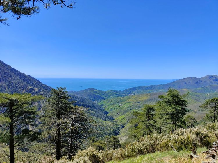 La vetta di Punta Martin proseguendo lungo il sentiero, copre la vista verso il mare, ma da questo punto si apre un affascinante panorama verso l’interno in cui non sembra neppure di essere in Liguria…