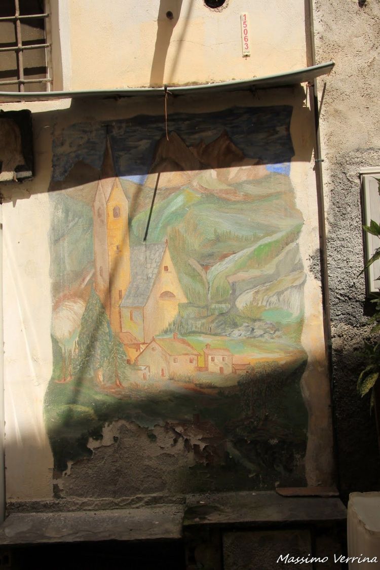 Poco distante, su un muro sgualcito dal tempo ecco un dipinto che sembra nascondersi fra le ombre, riproduce un borgo montano, forse le origini di questo borgo, quando ancora le strade non arrivavano e qui era solo campagna…