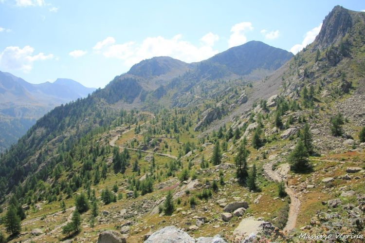 Dal sentiero dell’andata si può già vedere il lungo sentiero di rientro che chiude l’anello sul versante di fronte a noi. Nonostante la quota il caldo si faceva sentire parecchio, anche perché tutta la salita è in pieno sole, senza alcuna ombra…