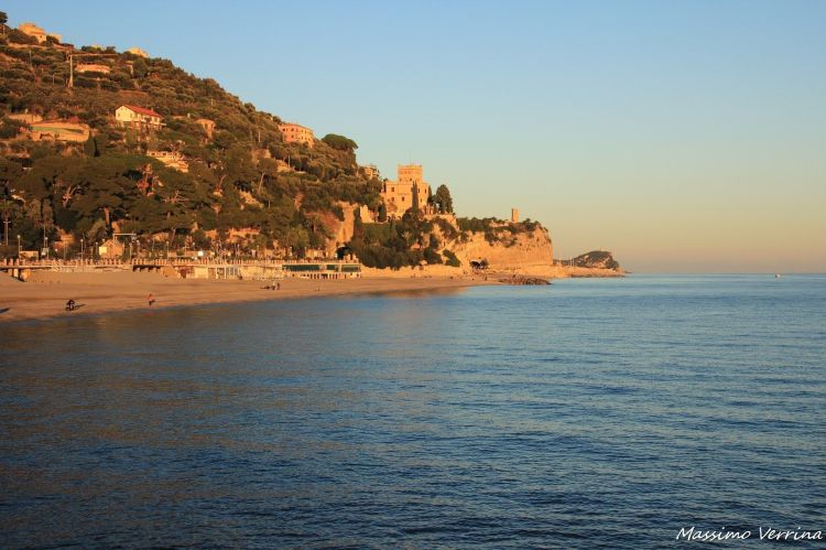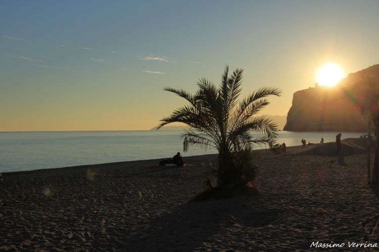 Voltandoci verso levante possiamo osservare la seconda spiaggia di Finale, dopo il torrente che separa le due spiagge, qui la luce dorata del tramonto bacia l’intero paesaggio, offrendo una visione incantevole e inusuale allo stesso tempo dell’intera costa…