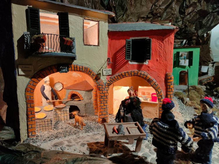 Anche in questa parte delle scenografia le sorprese non mancano, e sono davvero da lasciare a bocca aperta. Ecco ad esempio un fornaio mentre tira fuori la farinata dal forno, con altri piatti già pronti sul bancone. Sullo sfondo possiamo vedere un negozio di pescivendolo con la bilancia e un grosso pesce sul bancone….