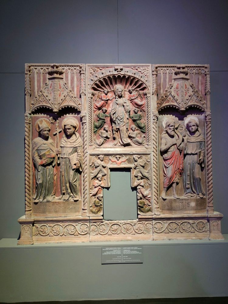 Chiudiamo questa breve sintesi del Museo di Sant’Agostino con questo trittico in marmo con ampie tracce di policromia, opera di un maestro lombardo della seconda metà del XV secolo. I colori delle tuniche rappresentati in questo trittico simboleggiano rispettivamente le tre virtù teologali, fede, speranza e carità..