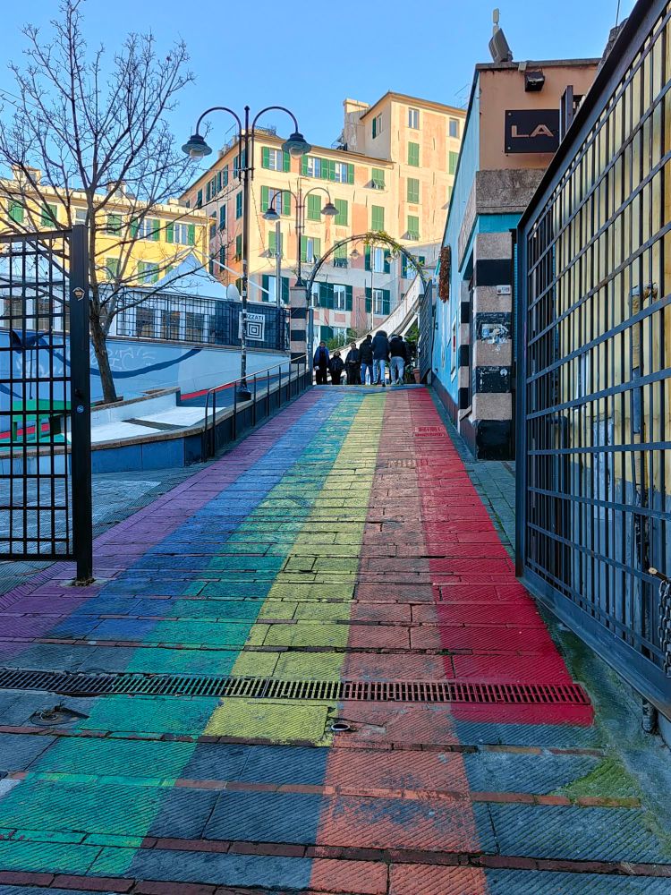 Guardate che bella questa strada colorata, è stata inaugurata il 17 maggio del 2022 e porta ai Giardini Luzzati. I colori l’avrete capito sono quelli della bandiera con cui si identificano i movimento LGBT. Qui un tempo c’era il degrado, oggi c’è una bella piazza con locali dove sedersi e consumare qualcosa, panchine, e anche un piccolo orto urbano….