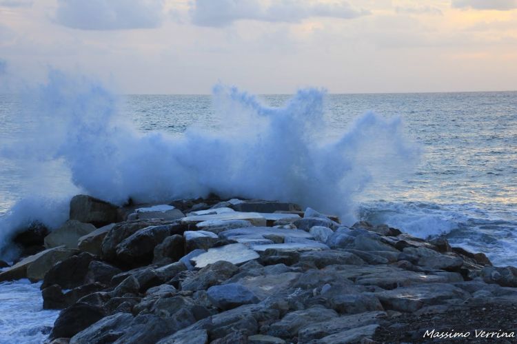 Ecco un bel maroso nell’atto di esplodere nella sua potenza urtando contro le scogliere, qualcuno potrebbe pure coglierci delle figure attraverso la forma degli spruzzi d’acqua, io ad esempio ci vedo la coda di un delfino…