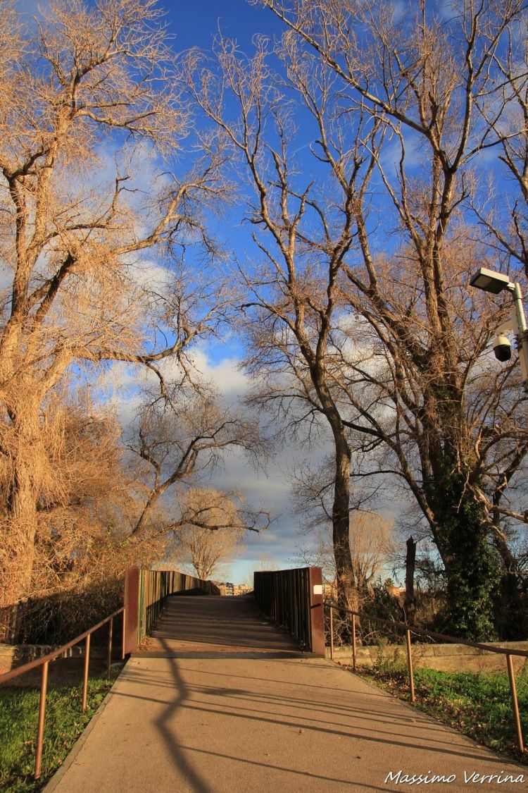 Ecco gli alberi spogli dell’inverno illuminati dalle tinte calde del tramonto mentre attraverso il ponte verso Camporosso..