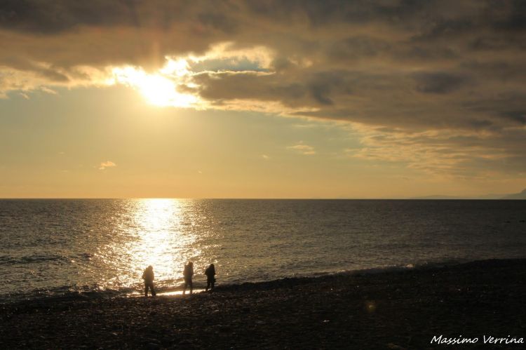 Il cielo si faceva in parte cupo, il sole spuntava da un lembo di nubi illuminando il mare. Cerco delle figure umane per creare prospettive e contrasti andandole a posizionare lungo la linea del sole…