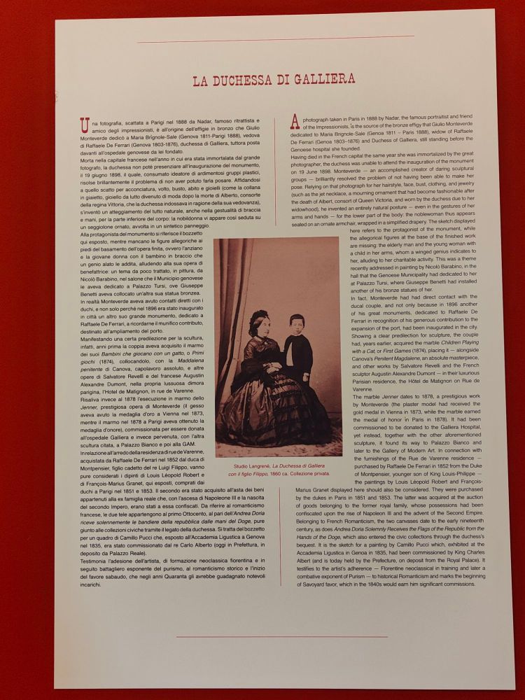 Il prossimo cartello introduce l’opera scultorea che andremo a scoprire, ed è dedicata alla Duchessa di Galliera, famosa nella mia cittadina per aver donato al Comune il suo vastissimo Parco situato poco distante da casa mia, dove vado molto spesso, e del quale parlerò in futuro….