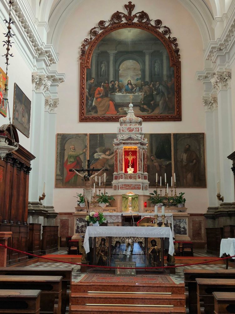 L’immagine di copertina di oggi che apre questo post vi fa vedere per intero la Chiesa di Santa Maria Nascente , quella che stiamo finendo di visitare. Ci avviciniamo all’altare per osservare da vicino alcuni particolari interessanti, fra cui due meravigliosi dipinti che dominano tutta la parete dietro all’altare…