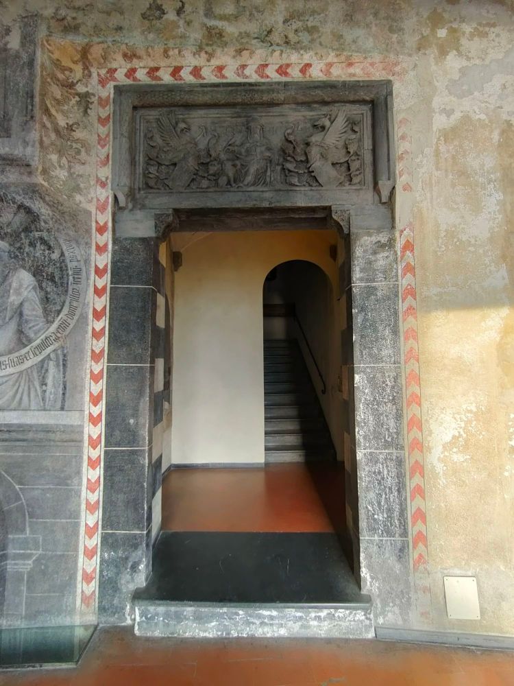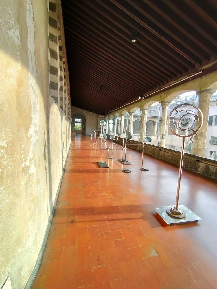 In apertura avete visto la bellezza di quelle colonne strette, un’apertura verso l’esterno davvero singolare, mi aveva colpito molto durante la visita. Ci spostiamo alla fine dell’ampio corridoio per osservare l’installazione di arte moderna vista da nuove prospettive…