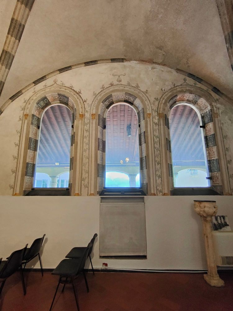 Non meno interessanti sono le tre aperture che danno sul corridoio esterno, anche in questo caso l’architettura abbraccia la bellezza dell’arte…