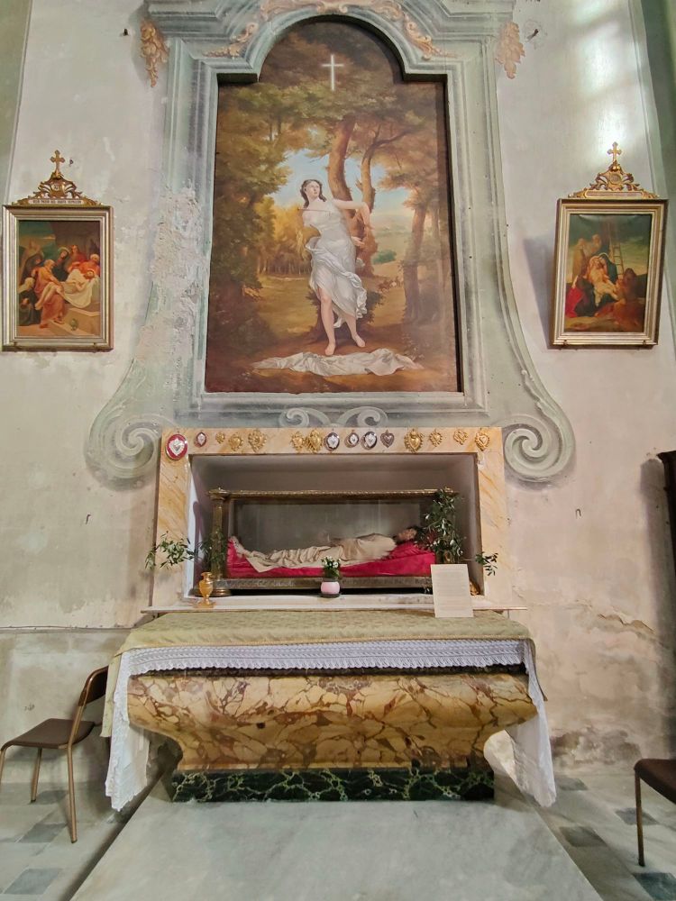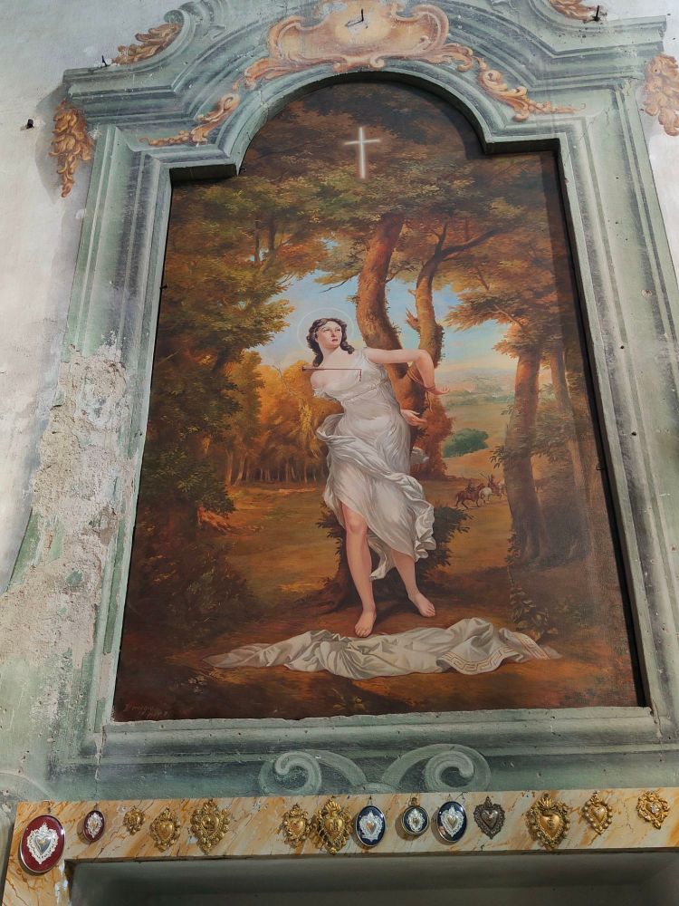 Fra i dipinti davvero belli che si possono osservare al suo interno c’è il prossimo che vi faccio ammirare, si tratta di Santa Giusta legata ad un albero con una freccia che le trafigge il petto. E’ un’opera abbastanza recente, del 1947 del pittore Beroggio. La sua bellezza sta nella ricostruzione scenica del tutto, con questo contrasto fra il dolore e il paesaggio attorno..