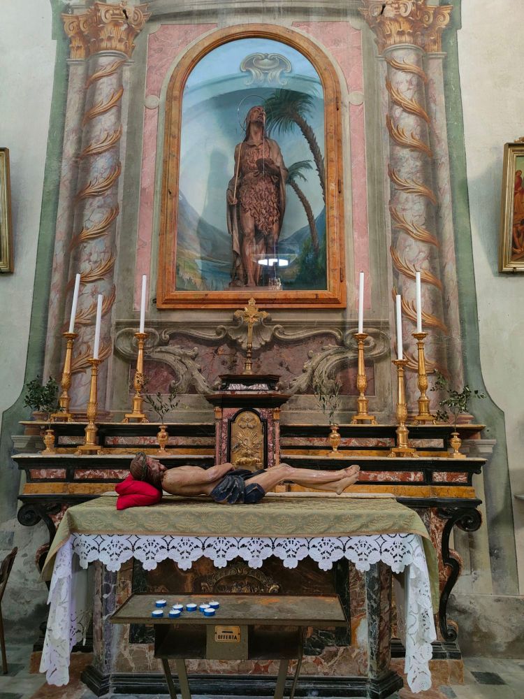 Poco distante troviamo a mio avviso quella che è l’opera più interessante di questa Chiesa, un Cristo posato su un tavolo ai piedi di un’opera altrettanto bella chiusa in una nicchia di vetro. Il colpo d’occhio emotivo di questa raffigurazione è davvero intenso…