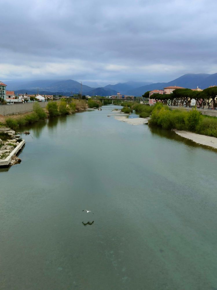 Ecco il fiume Centa che verso la foce crea dei bellissimi giochi di prospettive fotografiche. Qui ho voluto catturare il gabbiano che sorvolava il fiume specchiandosi nelle sue acque, oltre allo sfondo dei monti liguri..